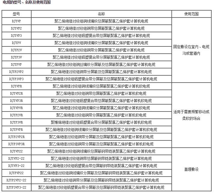 屏蔽材料有圓銅線、銅帶、鋁箔/塑料復合帶三種。屏蔽對與屏蔽對具有較好的絕緣性能,電纜在使用中若屏蔽對與屏蔽對之間出現(xiàn)電位差時,不會影響信號的傳輸質量。 計算機電纜的型號、名稱及使用范圍見表。
